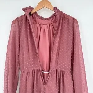 Trixxi Mauve Swiss Dot Tiered Mini Dress High Ruffle Neck Long Sleeve Women's M
