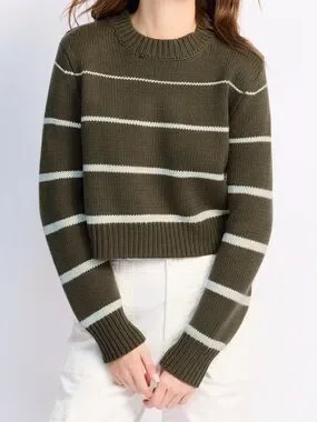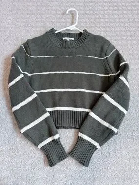 Soft crewneck cropped sweater in olive with cream stripes. Size small. No holes or rips.