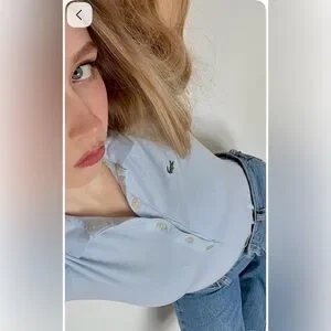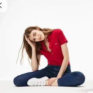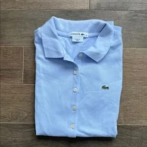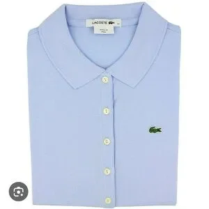 Classic women’s 5 button Lacoste polo tee. Light blue color. Short sleeves. Iconic crocodile logo on chest.