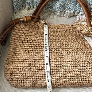 Tommy Bahama woven straw tote in natural hue. Rounded top handles with wrapped detailing. Decorative leather tassel accent. Spacious, casual design for everyday wear.