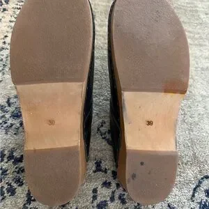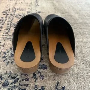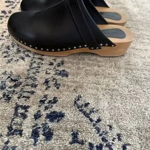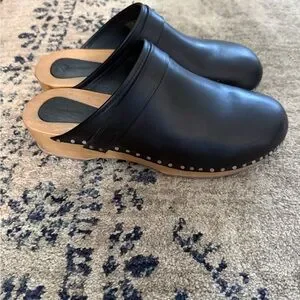Sleek black leather clogs with stud-accented trim. Slip-on mule silhouette for easy wear. Minimal, modern design that pairs with casual or dressed-up looks.