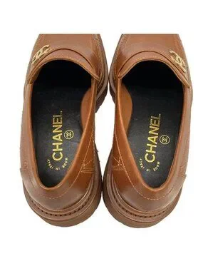 This is an authentic pair of Chanel Loafers in brown. The shoes are crafted from quilted calfskin leather and feature the iconic Chanel double C logo in gold hardware.