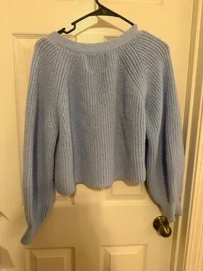 Soft light blue cropped cardigan from Princess Polly. V-neck design with front button closure for easy styling. Chunky rib knit gives cozy texture and comfortable warmth. Versatile piece that layers well over dresses and tops.