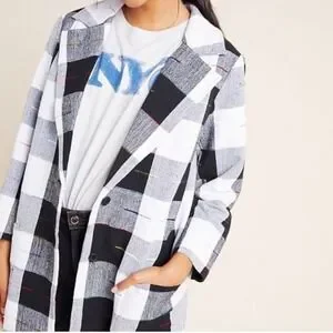 Longline blazer jacket in a bold black and white buffalo check pattern with unique rainbow embroidered dash details throughout. Crafted from a textured 100% cotton weave, this piece features a notched lapel, two-button front closure, and functional front patch pockets. The interior is fully lined for comfort, making it a versatile layering piece that transitions easily between seasons.
