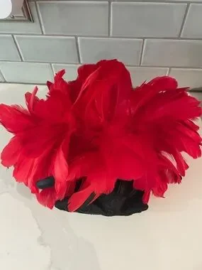 Vibrant red feathered purse. Dramatic, full plume design. Soft feathers with bold color. Easy statement accessory. Black and white interior with beaded black satin material.