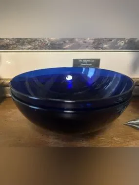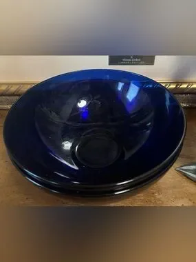 Elegant cobalt blue glass serving bowl. Rich blue color adds a sophisticated touch to any table. Smooth, reflective finish for a modern look. Versatile for serving or display. Includes the identified blue color in the design.