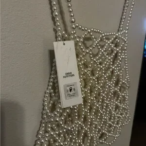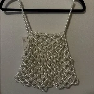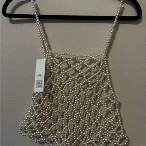 Pearl beaded net tank top by Urban Outfitters. Open lattice design with faux pearl beads. Strappy shoulders and a cropped silhouette. Stylish statement piece for layering.