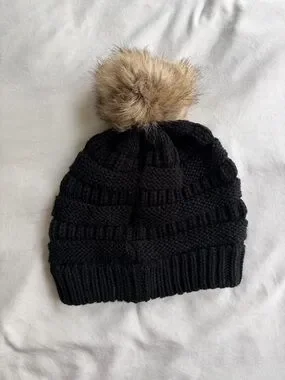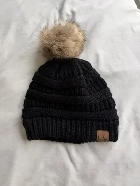 C.C Kids Black Knit Beanie with Tan Faux Fur Pom