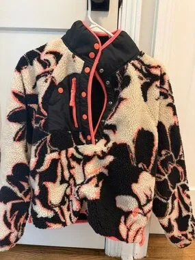 FP Movement by Free People Floral Sherpa Pullover Jacket in Cream, Black & Coral