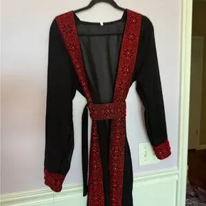 Elegant black maxi cardigan with bold red embroidered trim. Features deep V neckline and matching waist tie for a flattering silhouette. Long sleeves with red cuff detail add refined contrast. Perfect for evening events or stylish daytime wear. Perfect for Palestinian henna or events