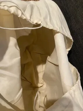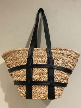 Handwoven straw tote featuring black faux-leather straps and trim. Lightweight and roomy for daily essentials. Stylish natural and black colorway pairs well with casual outfits. Easy to carry with comfortable shoulder straps. Small spots on bottom of inner lining highlighted in the pictures, has been treated with spot cleaner