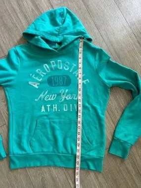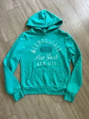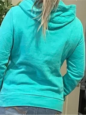Soft and cozy teal colored hoodie. Interior brand label sewn at neck.