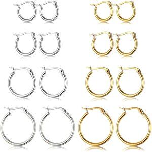 Women’s Stainless Steel Hoop Earrings Set 8 Pairs Gold Silver 10-20MM