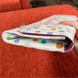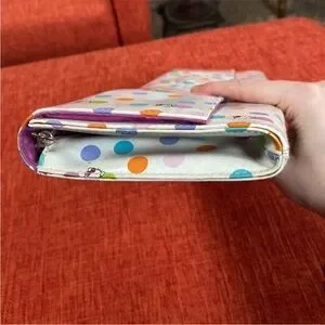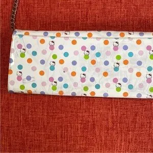 White PVC Vinyl with colorful orange blue pink purple polka dots with Hello Kitty Print