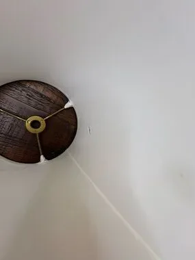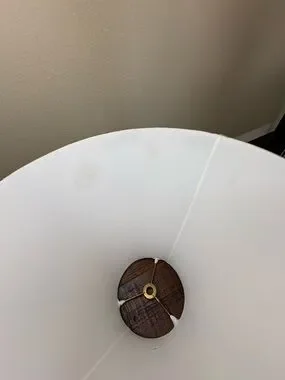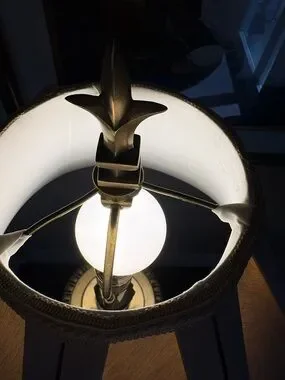 The brass shows some wear , and a little tarnish. The outside of the shade is perfect, the inside has a small tear and a couple marks cannot be seen from the outside. This is normal wear for the age, please look at photos and zoom in if needed. Still in great shape.