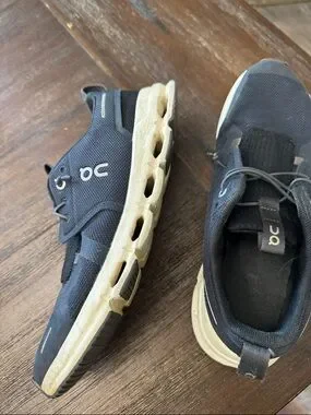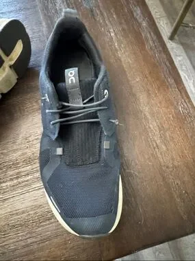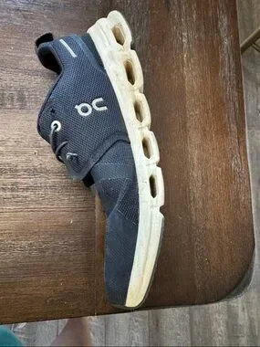 Kids running shoes by On Running in navy with white soles. Breathable mesh upper for comfort. Cloud-style midsole for cushioned support. Elastic lacing and pull tab for easy wear. Versatile casual athletic look.