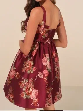Lulu’s Unbelievably Lovely Red Floral Babydoll Empire Waist Mini Dress