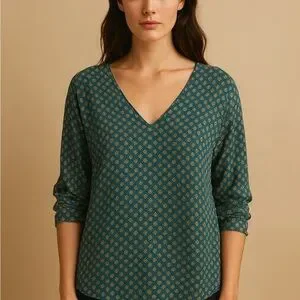 Beautiful Lucky Brand women’s blouse in size XL featuring an allover teal and gold micro-floral print. Designed with a flattering V-neckline in the front and a deep V-back with a tie closure for added detail. Lightweight woven fabric with long sleeves and a relaxed, easy silhouette. Slightly rounded hemline provides comfortable coverage and an elevated look.