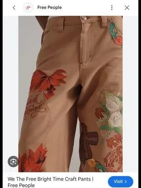 Tan We the Free chino pants with bold embroidered floral appliqués. Bright red, green, blue and cream stitched accents. Relaxed fit with hip and leg embellishments. Statement casual piece that pairs with simple tops. High waist, wide leg, and super comfy.