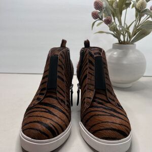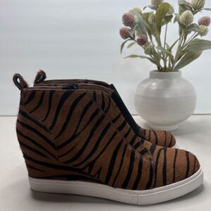 Linea Paolo Felicia Zebra Print Calf Hair Wedge Bootie Brown/Black Women 6.5 M