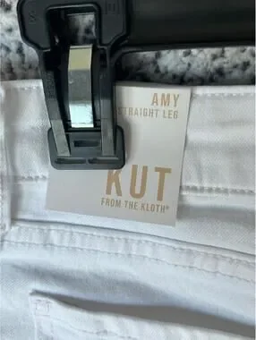 The Kut From the Kloth Women’s White Amy Crop Straight Leg Jeans in size 6P are a stylish and versatile addition to any woman's wardrobe. Made of 100% cotton denim, these jeans feature a solid white color, zip and button closure, and a mid-rise fit. The straight leg style and 5-pocket design make them a flattering and practical choice for the summer and spring seasons. Easy to care for with machine washable instructions, these jeans are perfect for everyday wear.