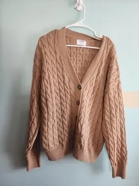 Only worn once! Old Navy cable knit V-neck cardigan in a warm camel color. Soft, textured knit with button-front closure for easy layering. Comfortable long sleeves and ribbed trims create a cozy, polished look. Versatile camel shade pairs well with casual and dress outfits.