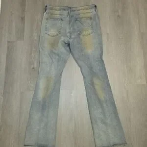 Denim jeans in light blue with visible rectangular patchwork. Frayed raw-edge details along seams. Classic pocket opening visible. Casual streetwear style. Skinny Flare fit.