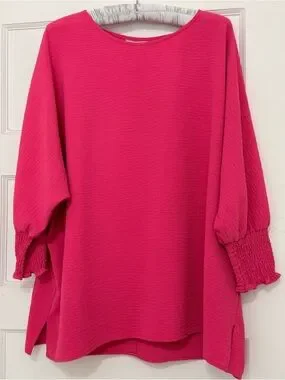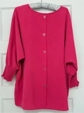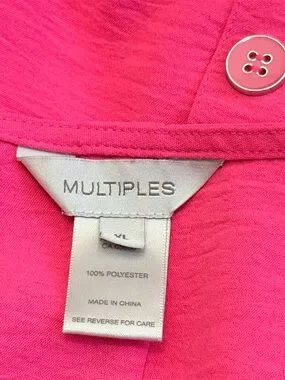 Multiples Blouse Hot Pink Magenta XL Scoop Neck Gathered Sleeves Faux Buttons