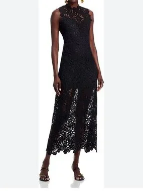 Aqua mock neck Sleeveless black maxi dress with intricate floral crochet overlay. fitted bodice flow into a semi-sheer skirt. Elegant and feminine silhouette. Perfect for evening events. NWT Size 2XL.