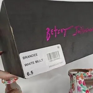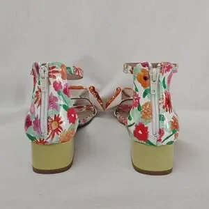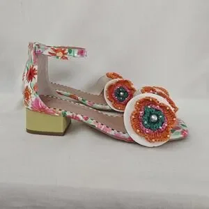 NEW..Playful floral sandals by Betsey Johnson. Ankle strap closure for a secure fit. Bold crochet flower accents on the toes. Chunky low heel with a bright finish. Vibrant all-over floral print.