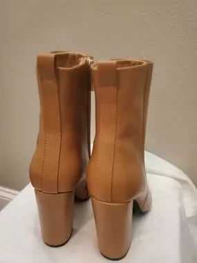 Chic tan ankle boots with a pointed toe. High block heel for stable elevation. Smooth faux-leather upper with side zipper closure. Modern, versatile style for day or night.