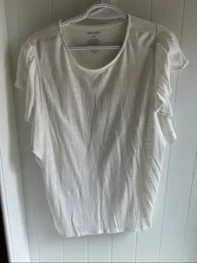 Lightweight white tee with subtle textured weave. Scoop neckline and flutter sleeves. Easy, versatile piece for layered or standalone styling.