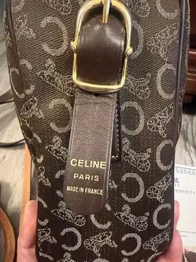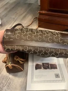 Celine crossbody with repeating 'C' monogram. Brown canvas body with tan monogram accents. Leather trim and adjustable strap. Zip-top closure and gold-tone hardware.