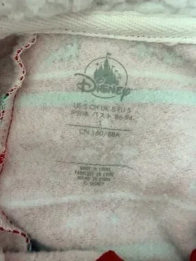 Disney one-piece pajama jumpsuit with Minnie Mouse holiday print. Soft, cozy fleece fabric. Hood with bow detail. Front zipper and kangaroo pocket. Festive, playful design for lounging or sleepwear. Like new!
