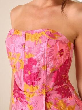Strapless floral mini dress in vibrant pink with yellow accents. Structured bodice for a tailored fit. Feminine floral jacquard pattern. Sleek, modern mini silhouette.