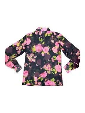 Pretty and feminine long sleeve black blouse with pink peony floral print. Light and airy. Iconic oversized 70s collar. In excellent condition. Wear it with a French tuck or tied.