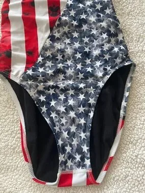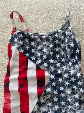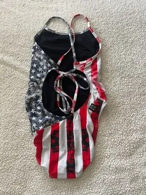 Patriotic one-piece with open back and tie detail. Bold red and white stripes with blue star field. Slim straps and athletic fit. Great for swim or beach activities.