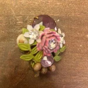 Beautiful earrings! Vintage, vg condition. Flowers are metal with crystal glass, amethyst glass, and faux pearls. One pearl has a little discoloration but other than that I don’t see any flaws. Really pretty! Clip style.