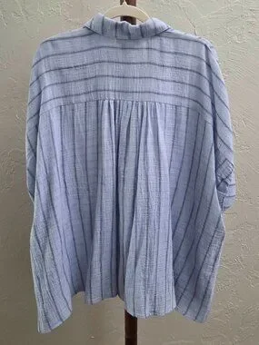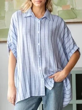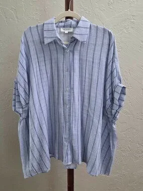Blue oversized button down shirt with cuffed dolman sleeves.