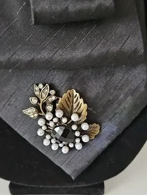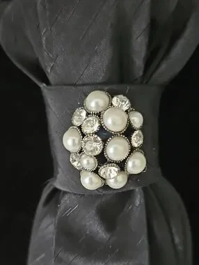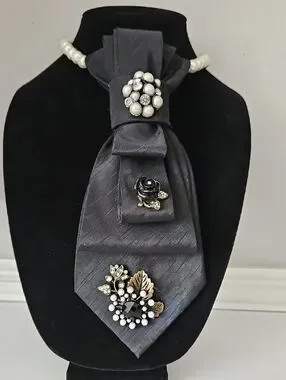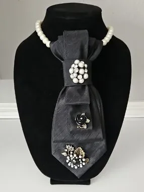 Black Upcycled Necktie Necklace with a Black Rose and Pearls