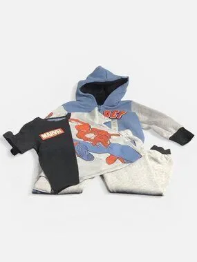 Marvel Spider-man Kids 3-piece Full Zip Lounge Set in size 3T is perfect for young boys who love the superhero Spider-Man. Made from a blend of polyester and cotton, this set includes a hooded zip sweatshirt with a graphic print of Spider-Man, a short sleeve t-shirt , jogger style pants and features a multicolor design. Ideal for all seasons, this lounge set is both comfortable and stylish, making it a great addition to any superhero fan's wardrobe. Perfect for winter, fall, or spring, this set is a must-have for any young Spider-Man enthusiast.