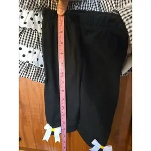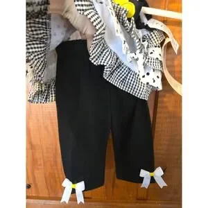 Rare Editions 2-piece outfit set features a layered ruffle tunic and coordinating leggings. The top is designed with alternating gingham and polka dot tiers, accented by a yellow floral appliqué with a black ribbon bow. Matching black leggings include white bow details at the hem for a complete, coordinated look. Ideal for spring or summer occasions, this set combines classic patterns with playful textures.