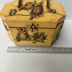 Wood Box 3D Decoupage Purse Octagon Brass Clasp Owls Vintage 60s/70s