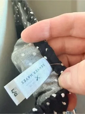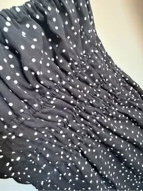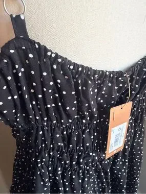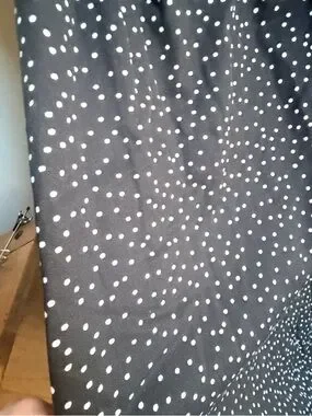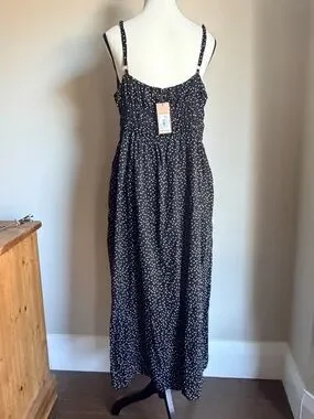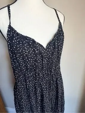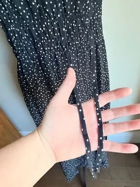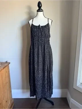 Lightweight maxi with adjustable spaghetti straps. Smocked waist for a flattering fit. Black fabric with small white polka dot pattern. Easy, breezy silhouette for everyday wear.