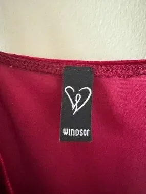 Rich wine velvet mini dress with a draped cowl front. Thin spaghetti straps and a sleek slip silhouette. Soft, lustrous fabric for evening wear. Deep, romantic wine color.