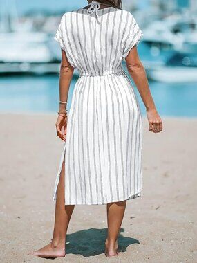 CUPSHE Women Beach Cover Up V Neck Short Sleeve Striped Midi Swimsuit Dress L