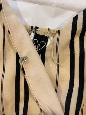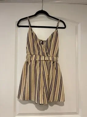 Windsor sleeveless romper with thin shoulder straps. V-neck wrap front and elastic waist. Flowy shorts with vertical stripes. Lightweight, classic striped design. Photo of small button that broke off at top.
