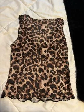 Leopard-print sleep cami with black lace trim. Lightweight, sheer fabric with a V-cross lace front. Feminine silhouette for nightwear or layering. Brown and black color combo.