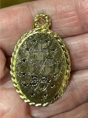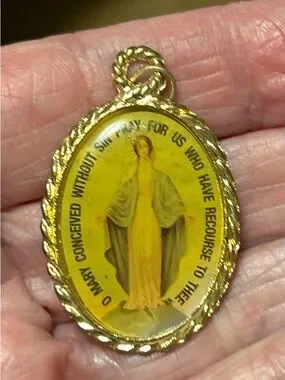 Gold-tone religious medal pendant with devotional image. Classic gold-colored frame offers a polished look. Designed for daily wear and layering. Features a vivid centerpiece for a warm, elegant accent. Sold as is. See photos for call outs.