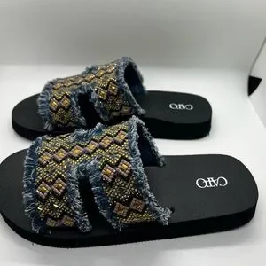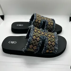 BRAND NEW Cato slide sandals with fringed denim straps. Intricate beaded geometric pattern across straps. Comfortable black footbed and sole. Stylish casual design.